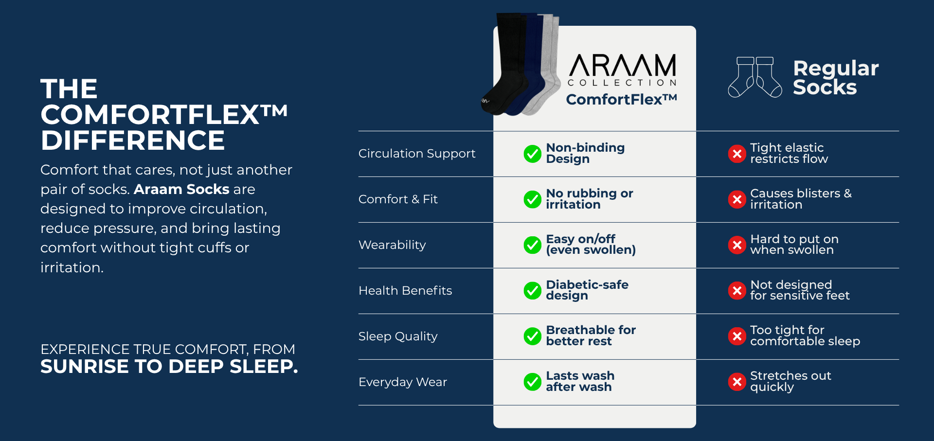 Araam socks are crafted with premium ring-spun combed cotton and a non-binding design that promotes healthy circulation. They stretch gently without leaving marks, giving you all-day comfort and relief.